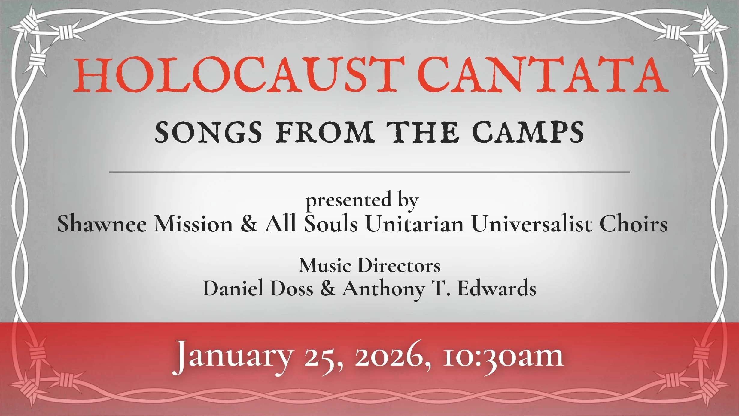 The SMUUCh Adult Choir is combining with the ALL SOULS UU Adult Choir to come together and perform the Holocaust Cantata on Sunday morning, January 11th. This special collaboration between our beloved UU communities has been created to bring attention to International Holocaust Remembrance Day on January 27, 2026.